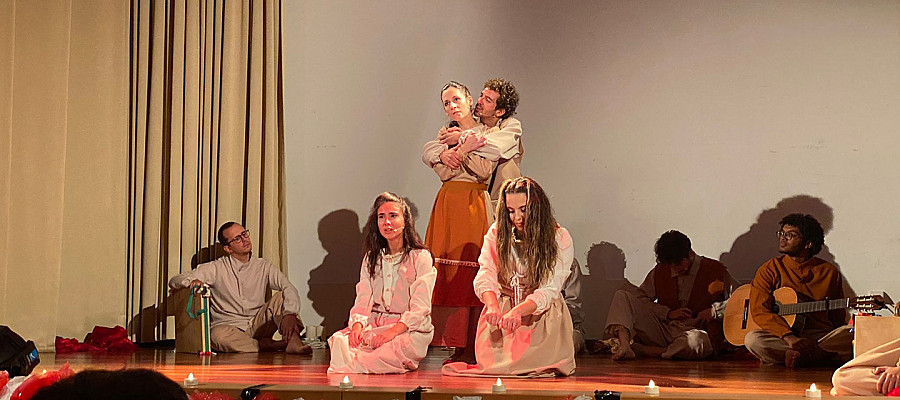 “Fomos extremamente bem recebidos, Vagos recebe muito bem pessoas. E também comemos bem [risos]”, começou por partilhar o diretor Simão Biernat. “A peça é um espetáculo com teatro, dança e música onde retratamos como é que as festas começaram e como se desenvolveram ao longo da história. As festas surgem com o povo - aqui temos uma primeira idade - e desaparecem. Depois regressam, em Alenquer, oficializadas pela Rainha Santa Isabel e pelo Rei D. Dinis - e desaparecem outra vez com as invasões francesas.