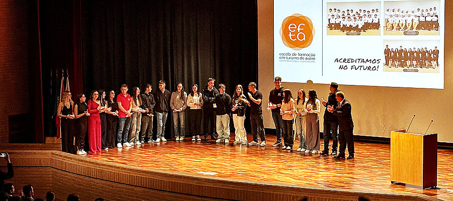 A EFTA – Escola de Formação em Turismo de Aveiro – assinalou formalmente o arranque do ano letivo 2024-2025 no dia 25 de outubro, numa cerimónia realizada no Centro Cultural e de Congressos de Aveiro. O momento ficou marcado pelas palavras do diretor Manuel Torrão, pela entrega de diplomas aos alunos que concluíram o seu ciclo de formação e de prémios aos que mais se distinguiram pela sua assiduidade e aproveitamento.